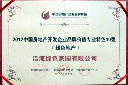 2012年10月16日,由中國(guó)房地產(chǎn)研究會(huì)、中國(guó)房地產(chǎn)業(yè)協(xié)會(huì)、中國(guó)房地產(chǎn)測(cè)評(píng)中心聯(lián)合主辦的“2012中國(guó)房地產(chǎn)品牌價(jià)值測(cè)評(píng)成果發(fā)布會(huì)”在北京召開,沿海集團(tuán)再次榮獲健康綠色地產(chǎn)榮譽(yù):“2012中國(guó)房地產(chǎn)開發(fā)企業(yè)品牌價(jià)值專業(yè)特色10強(qiáng)—綠色地產(chǎn)”