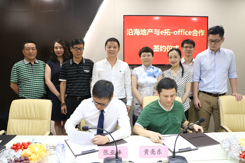 沿海地產副總裁張亞峰先生與奕拓公司總裁黃亮東先生分別代表雙方簽署了戰略合作協議。協議旨在推進沿海地產集中式物業與奕拓公司e拓-office眾創空間的整合與發展,實現優勢互補和共創雙贏。