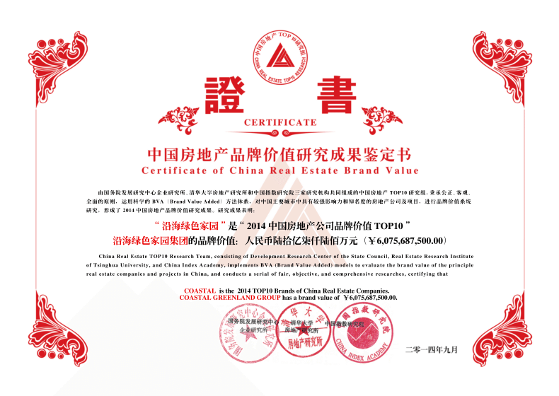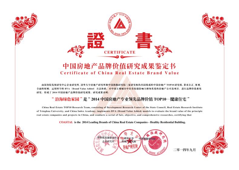 9月19日由國務院發展研究中心企業研究所、清華大學房地產研究所、中國指數研究院主辦、中國房地產TOP10研究組承辦的“2014中國房地產品牌價值研究成果發布會暨第十一屆中國房地產品牌發展高峰論壇”上,沿海綠色家園集團連續十一年榮膺“2014年中國房地產品牌價值TOP10”(混合所有)獎項,品牌價值更是升至60.76億。同時還榮獲“2014年中國房地產專業領先品牌價值top10-——健康住宅”獎項。