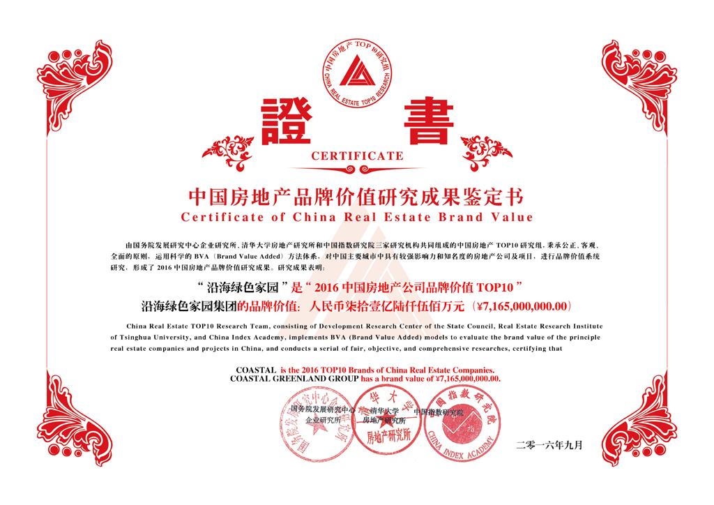 沿海綠色家園集團十三度蟬聯“中國房地產品牌價值TOP10”