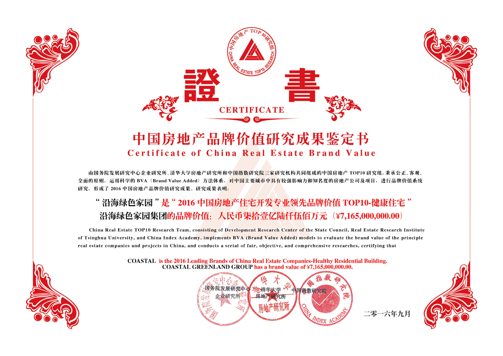 201696日,在國務院發展研究中心企業研究所、清華大學房地產研究所、中國指數研究院主辦、中國房地產TOP10研究組于北京雁棲湖國際會議中心承辦的“2016中國房地產品牌價值研究成果發布會暨第十三屆中國房地產品牌發展高峰論壇”上,沿海綠色家園集團(以下簡稱沿海集團)憑借其清晰的品牌定位、企業經營穩健性、及在健康住宅細分市場的領先優勢,連續13年榮登“中國房地產公司品牌價值top10”榜單,并榮獲“2016年中國房地產專業領先品牌價值top10-——健康住宅”獎項,其品牌價值較2015年增長12%71.65億元。